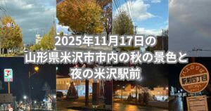 米沢市内の秋の景色と夜の米沢駅前の写真を収めた記事です(2025年11月17日)