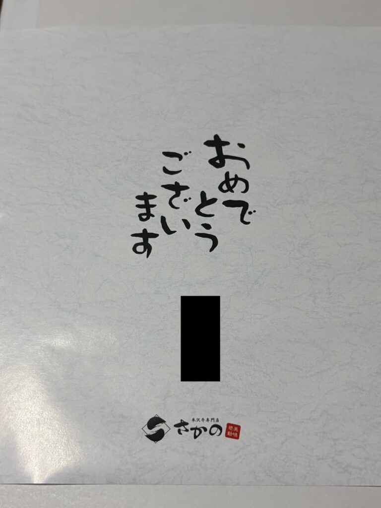 肉のさかのさんには「おめでとう」の一言を入れて頂きました。