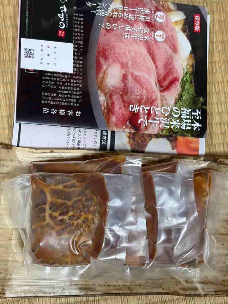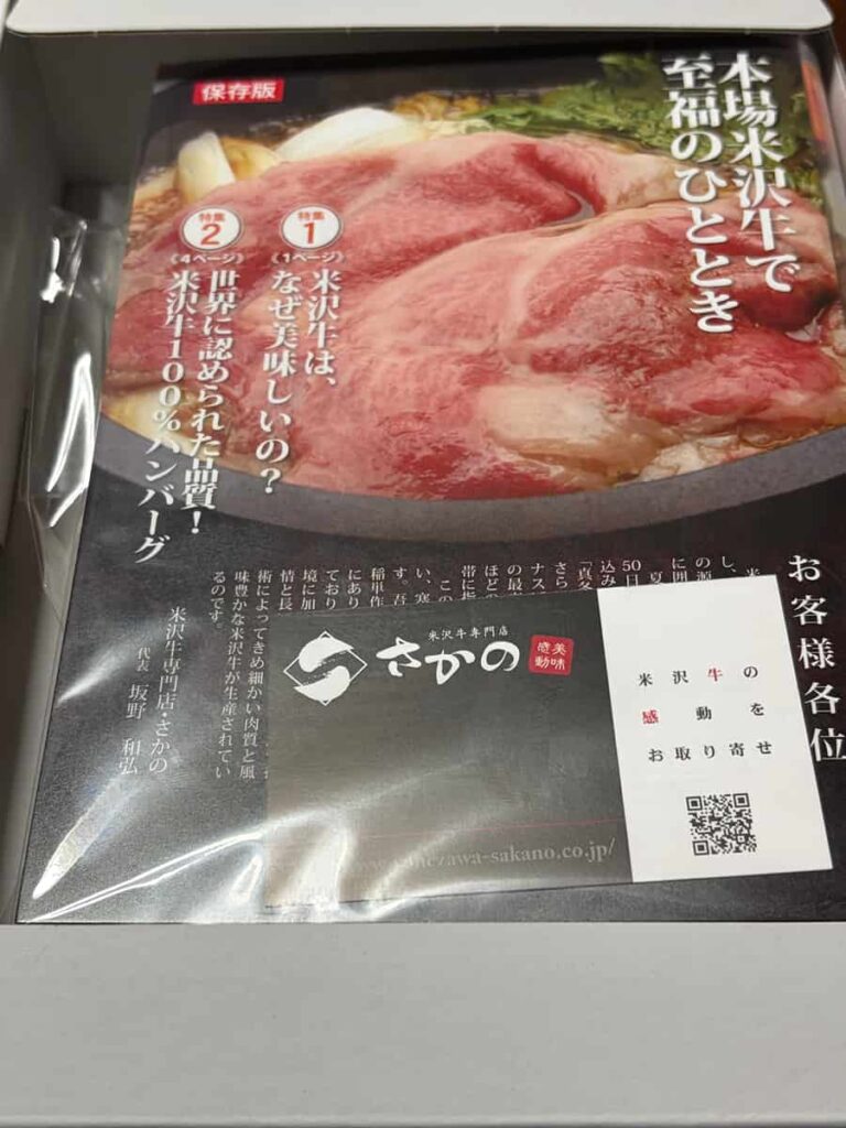 中にはお肉の他に「本場米沢牛で至福のひととき」と書かれた冊子と調理方法が書かれた用紙、それとアンケート用紙が入っていました。