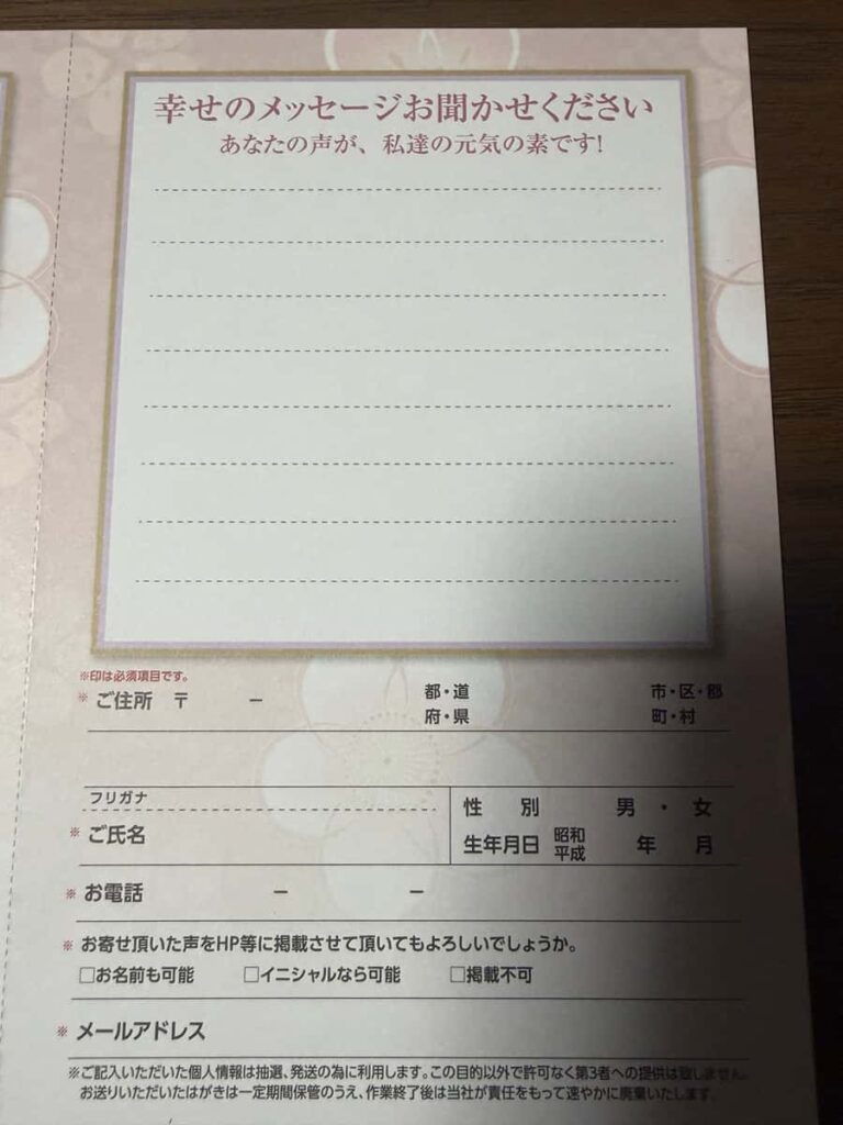 食べ終わった後はぜひ同封されているアンケート用紙「幸せのメッセージ」を、さかのさんにお届けください。