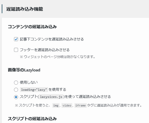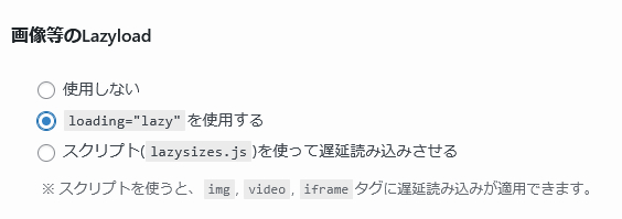 「画像等のLazyload」で「loading=”lazy”を使用する」を選ぶ。